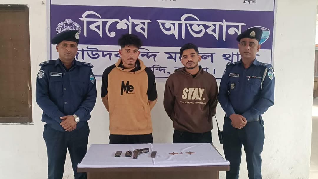 কুমিল্লার দাউদকান্দি মডেল থানা কর্তৃক লুটকৃত পিস্তল এবং গুলিসহ দুইজন আসামী গ্রেফতার।